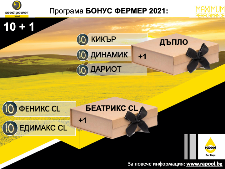 Бонусът е валиден единствено за семената, заявени със заявка в периода между 20.05.2021г. и 15.07.2021г.